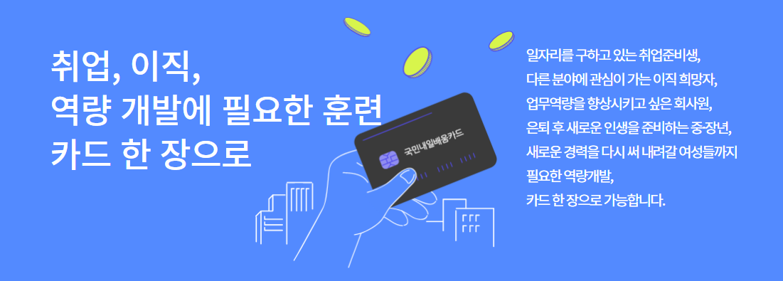 국민내일 배움 카드는 취업, 이직 또는 역량 개발에 필요한 훈련을 받을 수 있도록 지원해 주는 프로그램입니다. 특히, 재직자도 신청 조건을 충족한다면 이용할 수 있으니, 혹시라도 이직을 계획 중이신 직장인, 또는 구직을 희망하고 계신다면 한 단계 더 역량을 키울 수 있는 국민내일 배움 카드 자세히 알아보고 신청해 보세요.