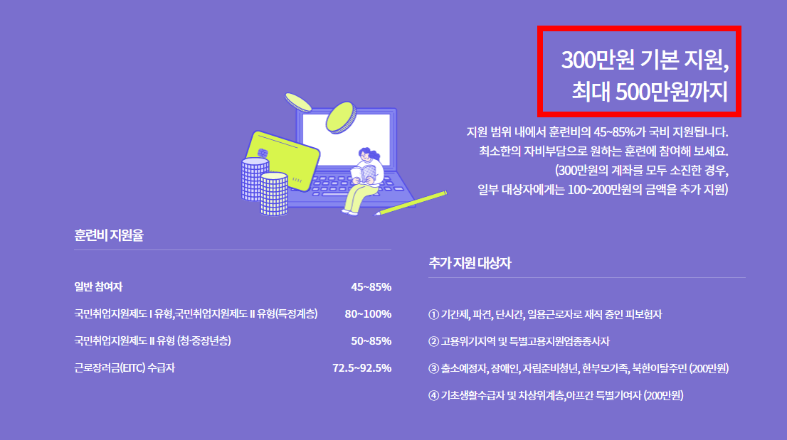 지원 금액은 기본적으로 300만 원이며, 최대 500만 원까지 지원받을 수 있습니다. 훈련비의 45~85%까지 국비 지원을 받게 되며, 이는 자비 부담을 크게 줄여줍니다.