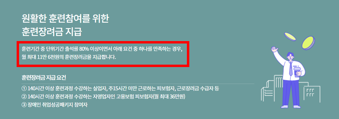 훈련 참여를 독려하기 위해 훈련장려금도 지급됩니다. 훈련 기간 중 출석률 80% 이상이면서 특정 조건을 만족하는 경우, 월 최대 11만 6천 원의 훈련장려금을 받을 수 있습니다.