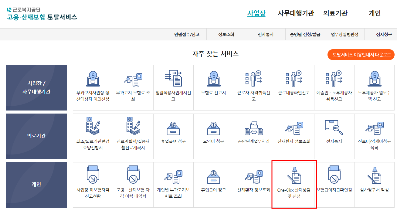 근로복지공단 로그인 후 One-Click 산재상담 및 신청을 클릭하여 신청하면 됩니다.