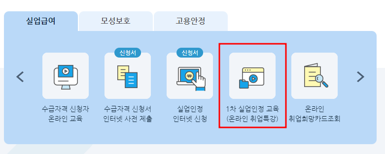 고용보험 홈페이지 (www.ei.go.kr) 또는 고용보험 모바일 어플 접속 후 “실업인정 인터넷 신청” 클릭 후 “구직 외 활동 ” 있음을 선택하고 “온라인 취업 특강 프로그램 ” 선택 후 1차 실업인정일 교육 입력 후 신청서 전송 (제출)