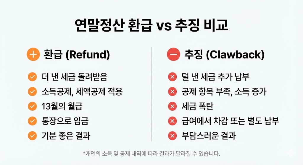 ✅ 환급: 1년 동안 원천징수로 미리 낸 세금이 실제 부담세액보다 많음 → 급여에 “플러스”